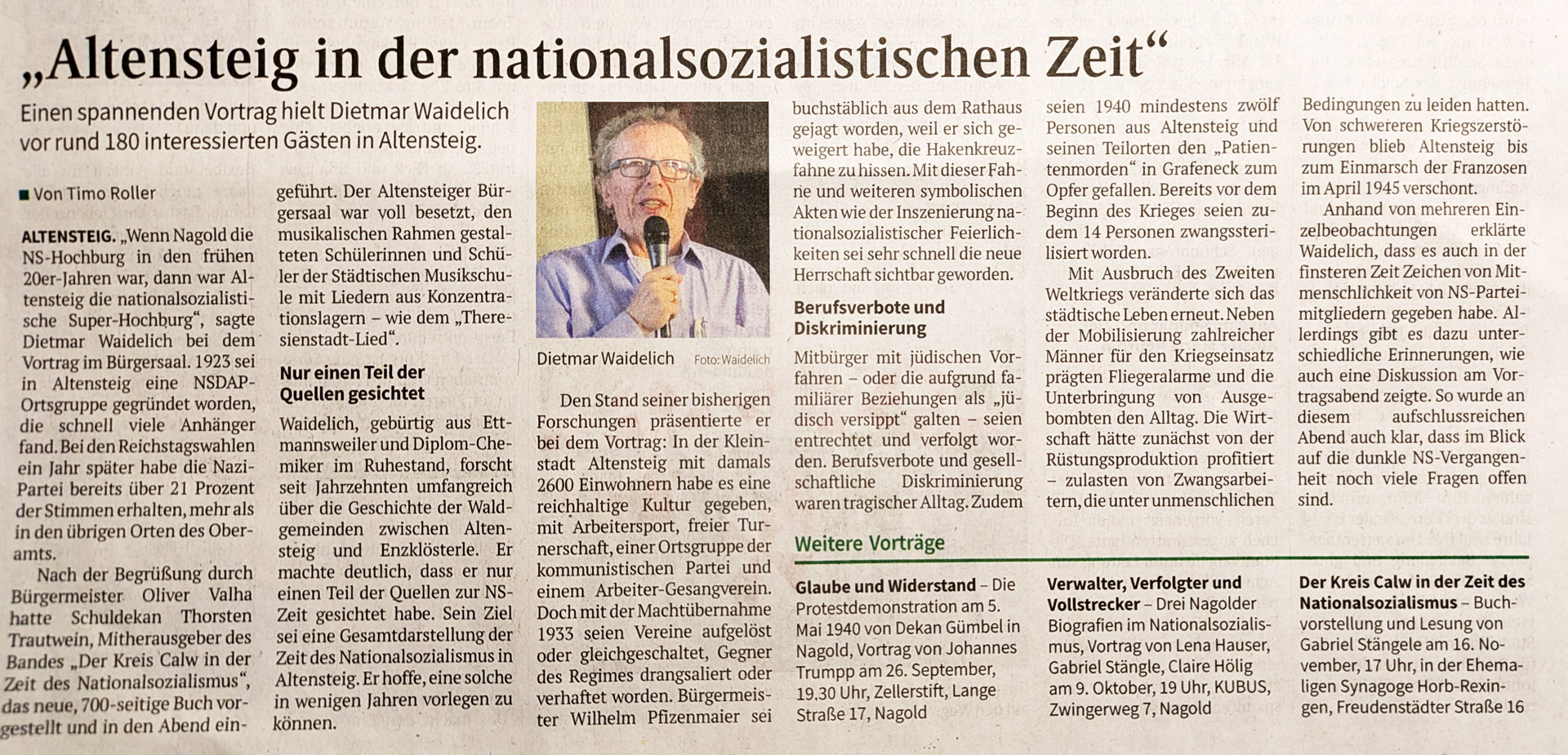 Auftakt war am Montag, den 15. September mit einem Vortrag über »Altensteig in nationalsozialistischer Zeit«. Dr. Dietmar Waidelich gab im Bürgersaal im Altensteiger Rathaus Einblicke in seine Forschungen über die Zeit von 1923 bis 1945.