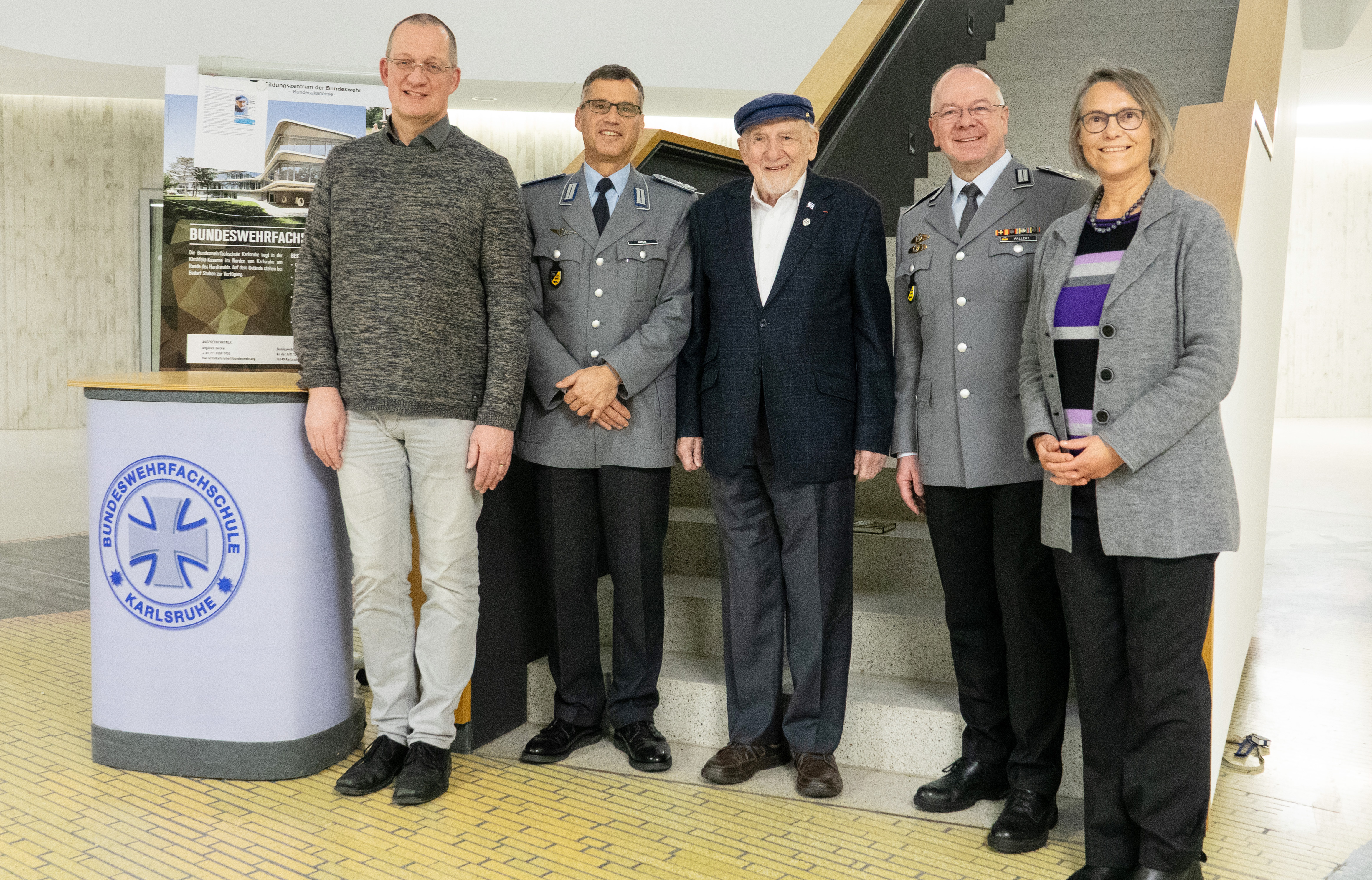 Mit den Worten »Welcome und Schalom« begrüßte Oberstudienrat Klaus Müller am Mittwoch, den 28. Januar in der Bundeswehrfachschule Karlsruhe einen ganz besonderen Gast: den 102-jährigen Holocaust-Überlebenden Walter Bingham. Mit dem »Kindertransport« entkam Bingham 1939 dem Schrecken der Nazis und dem wohl sicheren Tod. Seine Über-Lebensgeschichte erzählte der Zeitzeuge anlässlich des internationalen Holocaust-Gedenktags Schülerinnen und Schülern der Bundeswehrfachschule Karlsruhe. Der Vortrag fand in Kooperation mit dem Verein Zedakah statt.